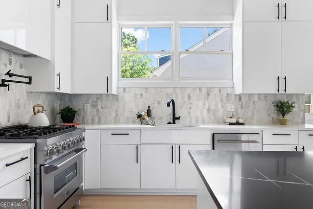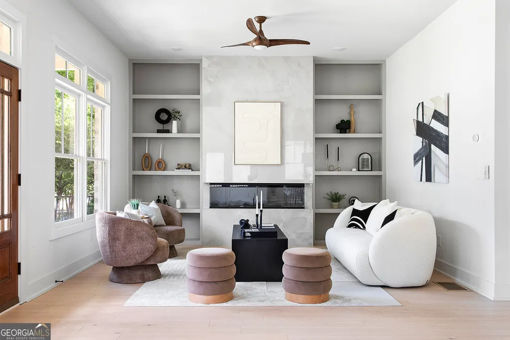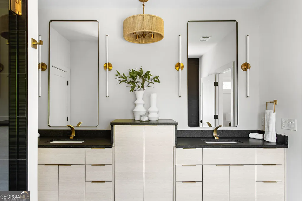Embark on a journey of modern elegance with this gorgeous 4-bedroom, 4-bathroom sanctuary, set upon an expansive .40 acre lot in the vibrant heart of East Lake. Designed with a seamless blend of contemporary flair and timeless sophistication, this home boasts an expansive layout accentuated by soaring 10ft+ ceilings and exquisite wide-plank flooring. The living room serves as the focal point, showcasing a sleek custom built-in wall with ample shelving space and a striking porcelain tile fireplace, inviting both warmth and engaging conversations. Retreat outdoors to the covered front porch, offering a serene space to relax and soak in the neighborhood ambiance. Adjacent to the living area, a formal seating and dining space awaits, adorned with a stunning Natural Large CF Woven Chandelier, perfect for hosting gatherings and entertaining guests. The kitchen features a generously sized island adorned with luxurious quartz countertops, porcelain tile backsplash, and high-end Z-line appliances. A dedicated bar area adds a touch of sophistication, ideal for evening cocktails and intimate gatherings. The lower level presents a versatile bedroom and full bathroom, ideal for a home office or guest suite. Upstairs, discover a private retreat in each bedroom, with all second-level bedrooms boasting full ensuite bathrooms. The master suite exudes tranquility, boasting custom built-in bench seating surrounding a captivating centerpiece fireplace and a spacious walk-in closet. Step onto the primary suite balcony to overlook the backyard and start your day on a serene note. The primary bathroom offers a spa-like ambiance with dual floating vanities, built-in LED lighting, and abundant cabinet storage. Indulge in relaxation with a soaking tub and separate oversized rainfall shower. Outside, the expansive lot beckons endless possibilities, with an oversized 2-car garage providing additional storage. Whether envisioning verdant landscapes, an outdoor entertainment haven, or even a future pool or ADU, each possibility contributes to crafting your personal oasis in this East Lake residence. Conveniently located just minutes from Oakhurst Village, the shops and restaurants of Kirkwood, and downtown Decatur, this home offers unparalleled access to the vibrant Atlanta scene. Welcome home to luxurious living at its finest.